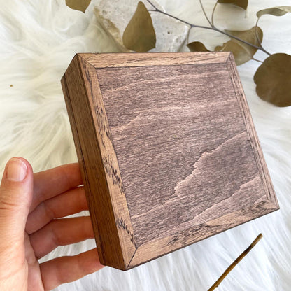 The lid is engraved with a quote based on a line by Carly Jung that says "Who looks inside Awakens", and the back of the box is engraved with a medicine prayer, reminding us of our journey, of our strength and of how we wish to move forward in life.