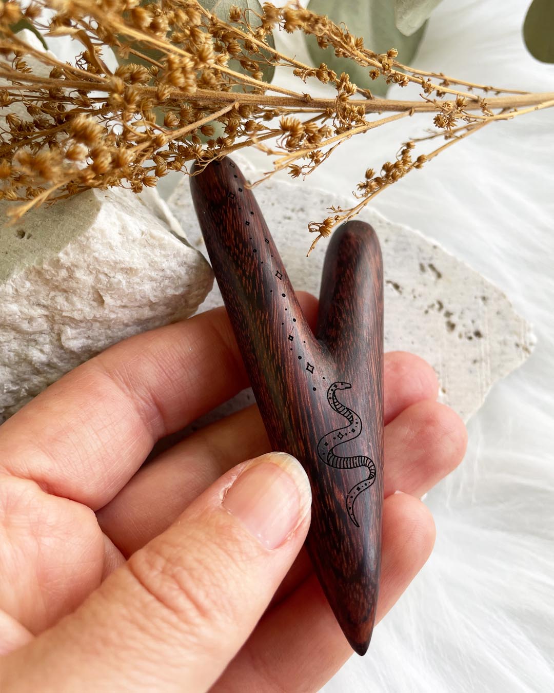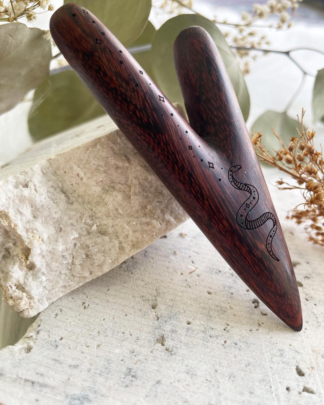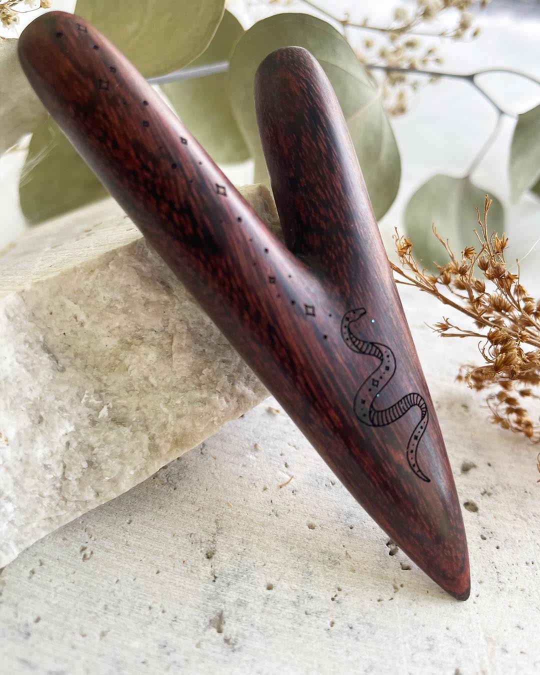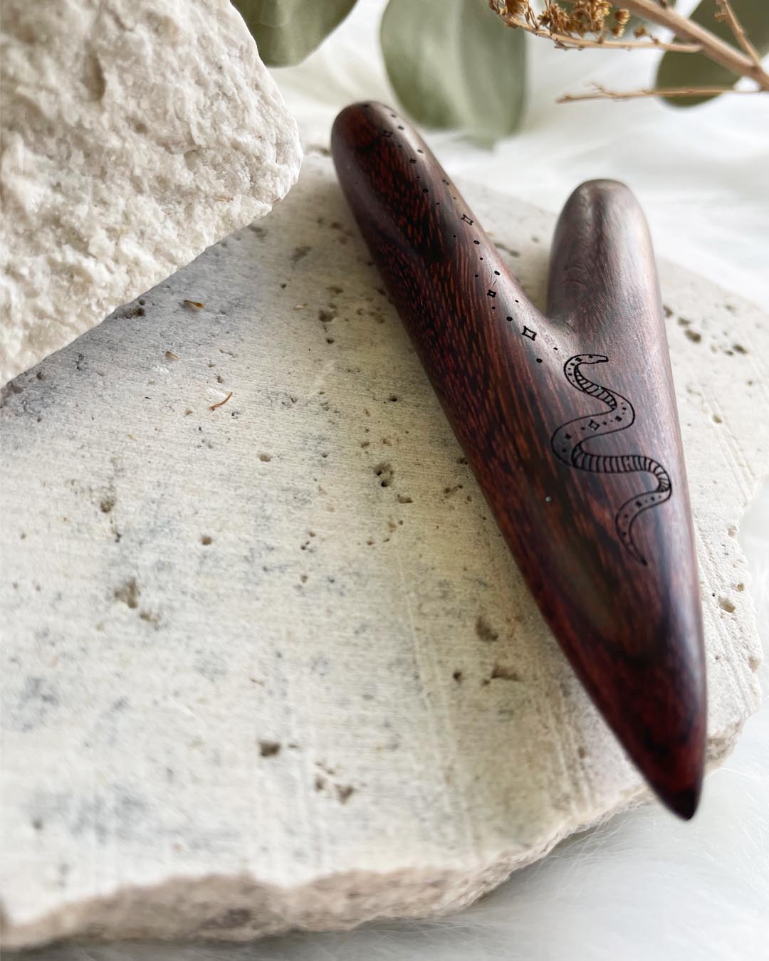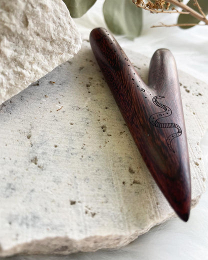 This Kuripe is hand-made from tamarind wood & engraved with a Snake.