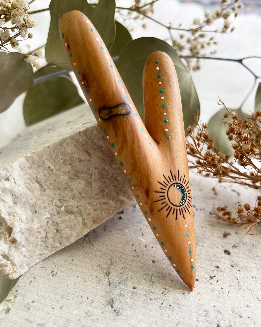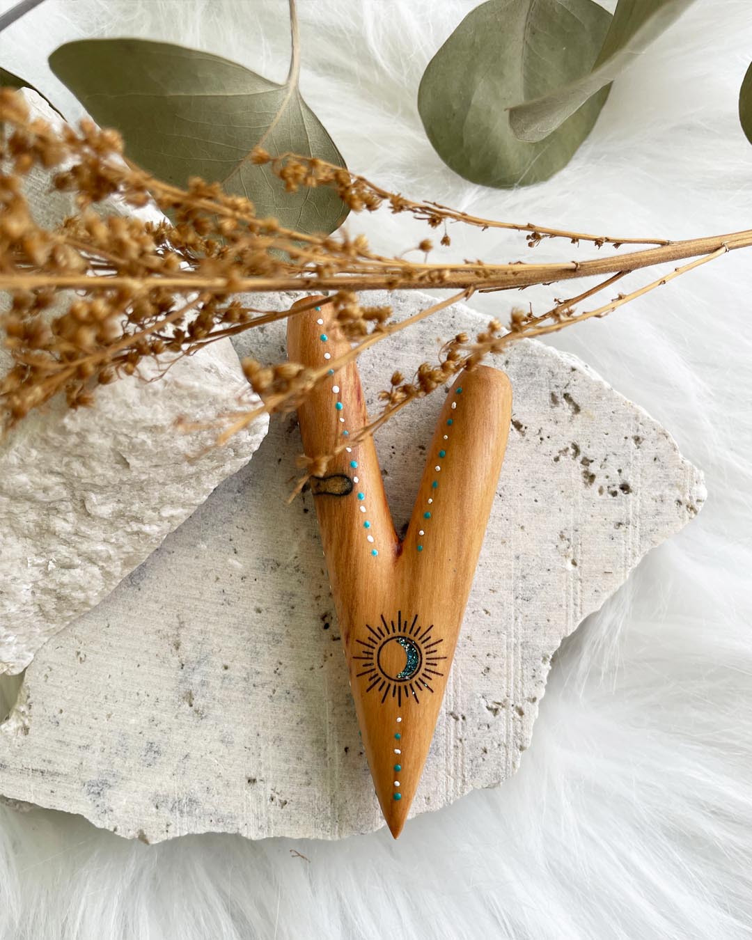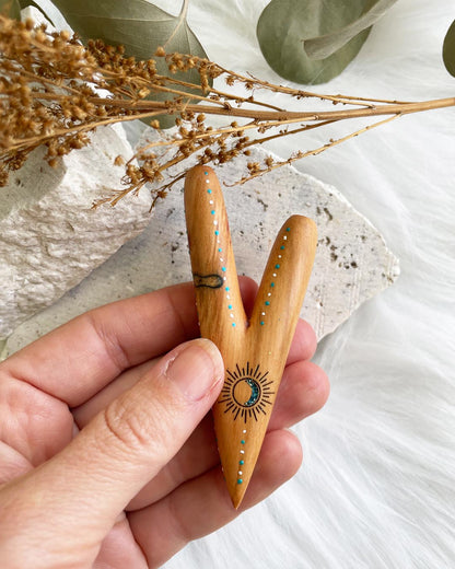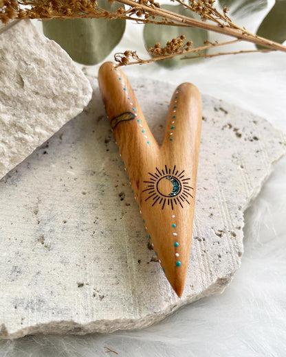 Our Indigenous Sun & Moon Sawo Kuripe is made from Sawo Wood with medium weight. It's made from one piece of wood, has good airflow and is polished for sleekness and shine. Our Sawo wood is a light earthy brown tint, however each piece can vary slightly, with different markings due to the natural material of wood. The Sun & Moon represent the dark and the light, output & input and the balance between the masculine and feminine energies.